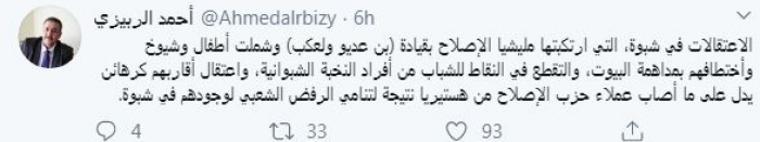 وقال في تغريدة عبر "تويتر" رصدها "المشهد العربي": "الاعتقالات في شبوة، التي ارتكبتها مليشيا الإصلاح بقيادة (بن عديو ولعكب) وشملت أطفال وشيوخ واختطافهم بمداهمة البيوت، والتقطع في النقاط للشباب من أفراد النخبة الشبوانية، واعتقال أقاربهم كرهائن يدل على ما أصاب عملاء حزب الإصلاح من هستيريا نتيجة لتنامي الرفض الشعبي لوجودهم في شبوة".