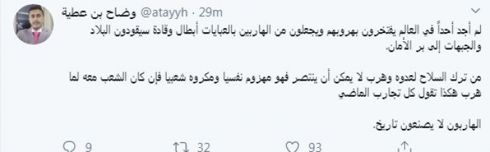 وقال في تغريدة عبر "تويتر" رصدها "المشهد العربي": "لم أجد أحداً في العالم يفتخرون بهروبهم ويجعلون من الهاربين بالعبايات أبطال وقادة سيقودون البلاد والجبهات إلى بر الأمان".