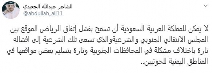 وكتب في تغريدة عبر "تويتر" رصدها "المشهد العربي": "لا يمكن للمملكة العربية السعودية أن تسمح بفشل اتفاق الرياض الموقع بين المجلس الانتقالي الجنوبي والشرعية والذي تسعى تلك الشرعية إلى إفشاله تارة باختلاق مشكلة في المحافظات الجنوبية وتارة بتسليم بعض مواقعها في المناطق اليمنية للحوثيين".
