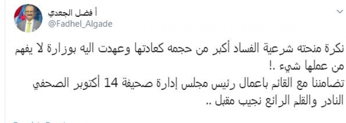 وقال في تغريدة عبر "تويتر" رصدها "المشهد العربي": "نكرة منحته شرعية الفساد أكبر من حجمه كعادتها وعهدت إليه بوزارة لا يفهم من عملها شيء. تضامننا مع القائم بأعمال رئيس مجلس إدارة صحيفة 14 أكتوبر الصحفي النادر والقلم الرائع نجيب مقبل".