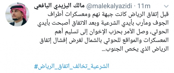 وكتب اليافعي، في تغريدة له عبر موقع التواصل الاجتماعي تويتر، تابعها المشهد العربي: "قبل اتفاق الرياض كانت جبهة نهم ومعسكرات أطراف الجوف ومأرب بأيدي الشرعية وبعد الاتفاق أصبحت بأيدي الحوثي".