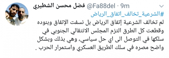 تفاعل رئيس دائرة الشباب بالمجلس الانتقالي الجنوبي فضل محسن الشطيري، مع هاشتاج "الشرعية تخالف اتفاق الرياض".