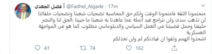 قال عضو هيئة رئاسة المجلس الانتقالي الجنوبي فضل الجعدي، اليوم، إن تضحيات شعب الجنوب لن تذهب سدى، مُطالبًا الجنوبيين بالثقة في المجلس الانتقالي الجنوبي.