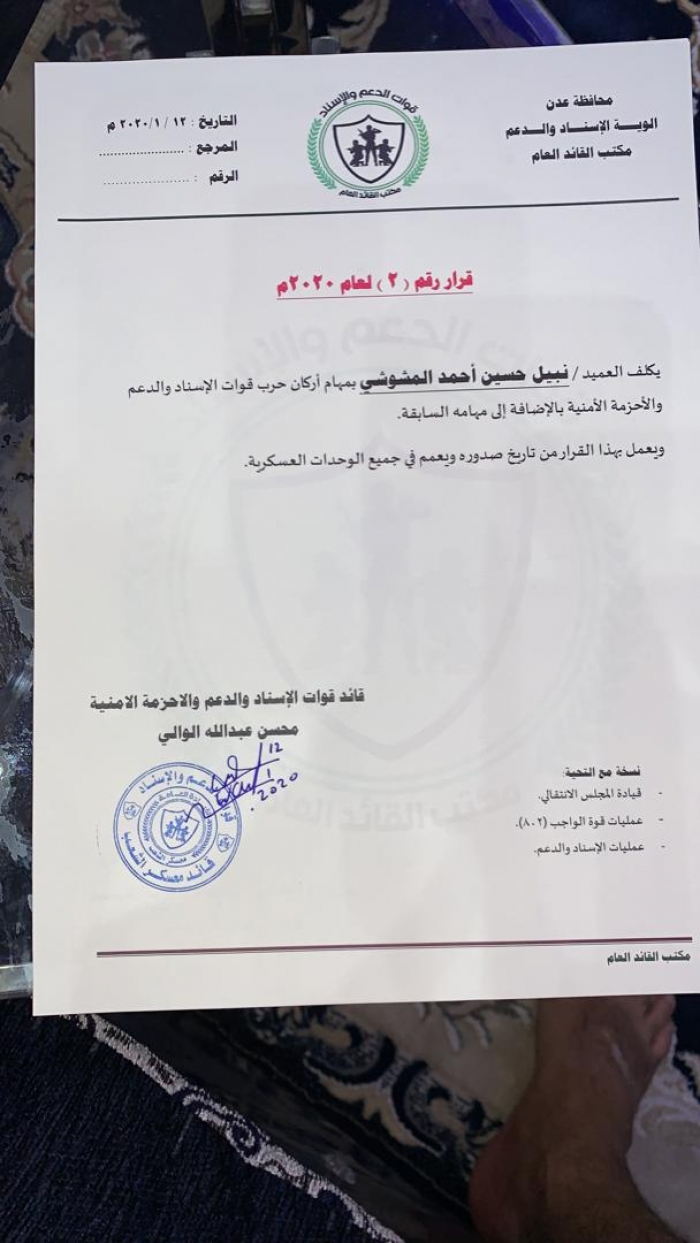 ونص قرار القائد العام للقوات محسن عبدالله الوالي، بتكليف العميد نبيل المشوشي، قائد اللواء الثالث دعم وإسناد بمهام قائد أركان حرب قوات الدعم والإسناد .