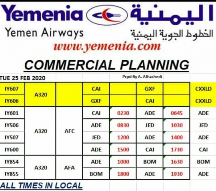 ينشر "المشهد العربي" مواعيد رحلات طيران اليمنية غداً الثلاثاء، الموافق 25 فبراير 2020.