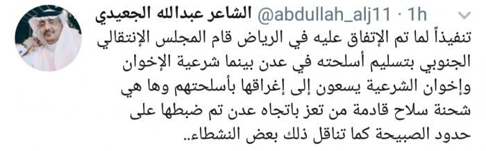 وكتب الجعيدي، في تغريدة له عبر موقع التواصل الاجتماعي تويتر، تابعها المشهد العربي: "تنفيذاً لما تم الاتفاق عليه في الرياض قام المجلس الانتقالي الجنوبي بتسليم أسلحته في عدن بينما شرعية الإخوان وإخوان الشرعية يسعون إلى إغراقها بأسلحتهم".
