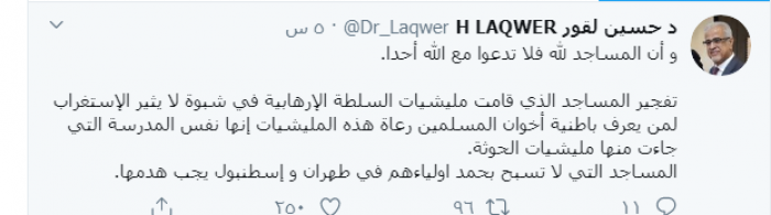 وكتب لقور عبر "تويتر":"و أن المساجد لله فلا تدعوا مع الله أحدا،تفجير المساجد الذي قامت مليشيات السلطة الإرهابية في شبوة لا يثير الاستغراب لمن يعرف باطنية إخوان المسلمين رعاة هذه المليشيات إنها نفس المدرسة التي جاءت منها مليشيات الحوثة"..