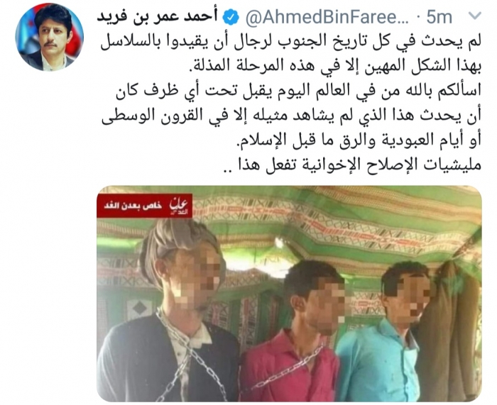 وكتب بن فريد، في تغريدة له عبر موقع التواصل الاجتماعي تويتر، تابعها المشهد العربي: "لم يحدث في كل تاريخ الجنوب لرجال أن يقيدوا بالسلاسل بهذا الشكل المهين إلا في هذه المرحلة المذلة".