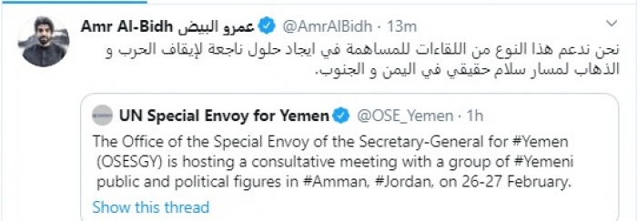 وقال في تغريدة عبر "تويتر" رصدها "المشهد العربي": "نحن ندعم هذا النوع من اللقاءات للمساهمة في إيجاد حلول ناجعة لإيقاف الحرب والذهاب لمسار سلام حقيقي في اليمن والجنوب".