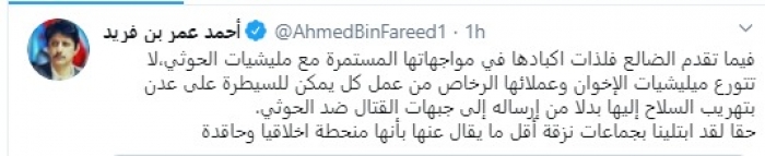 بن فريد يُهاجم مليشيات الإخوان بسبب محاولات تهريب السلاح للعاصمة عدن