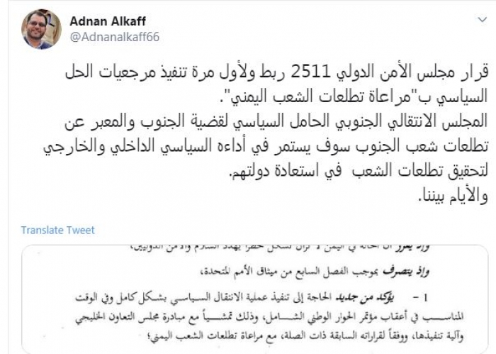 وكتب في تغريدة عبر "تويتر" رصدها "المشهد العربي": "قرار مجلس الأمن الدولي 2511 ربط ولأول مرة تنفيذ مرجعيات الحل السياسي بمراعاة تطلعات الشعب اليمني. المجلس الانتقالي الجنوبي الحامل السياسي لقضية الجنوب والمعبر عن تطلعات شعب الجنوب سوف يستمر في أداءه السياسي الداخلي والخارجي لتحقيق تطلعات الشعب في استعادة دولتهم. والأيام بيننا".