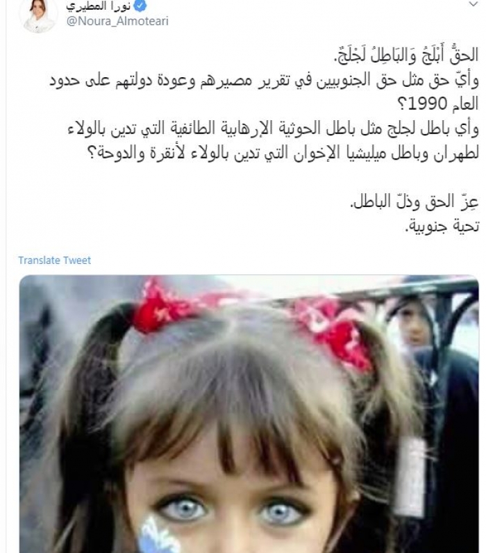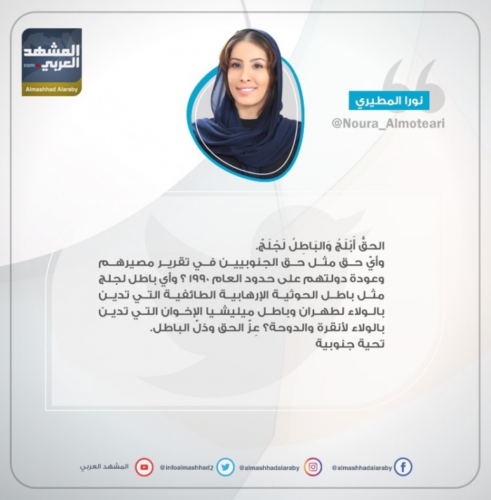 وقالت في تغريدة عبر "تويتر" رصدها "المشهد العربي": "الحقُّ أَبْلَجُ وَالبَاطِلُ لَجْلَجٌ. وأيّ حق مثل حق الجنوبيين في تقرير مصيرهم وعودة دولتهم على حدود العام 1990؟، وأي باطل لجلج مثل باطل الحوثية الإرهابية الطائفية التي تدين بالولاء لطهران وباطل ميليشيا الإخوان التي تدين بالولاء لأنقرة والدوحة؟، عِزّ الحق وذلّ الباطل. تحية جنوبية".
