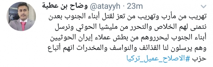 وتابع: "نتمنى لهم الخلاص والتحرر من مليشيا الحوثي ونرسل أبناء الجنوب ليحرروهم من بطش عملاء إيران الحوثيين وهم يرسلون لنا القذائف والنواسف والمخدرات إنهم أتباع حزب الإصلاح".