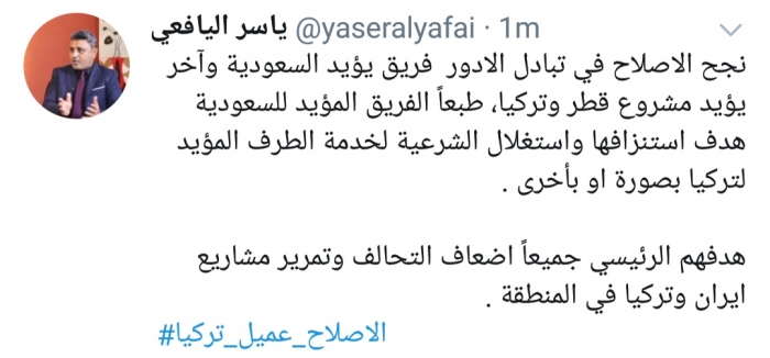 وكتب اليافعي، في تغريدة له عبر موقع التواصل الاجتماعي تويتر، تابعها المشهد العربي: "نجح الإصلاح في تبادل الأدوار.. فريق يؤيد السعودية وآخر يؤيد مشروع قطر وتركيا".