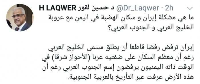 وتساءل لقور، في تغريدة له عبر موقع التواصل الاجتماعي تويتر، تابعها المشهد العربي: "ما هي مشكلة إيران وسكان الهضبة في اليمن مع عروبة الخليج العربي و الجنوب العربي؟".