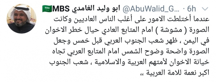 وكتب الغامدي، في تغريدة له عبر موقع التواصل الاجتماعي تويتر، تابعها المشهد العربي: "عندما أختلطت الأمور على أغلب الناس العاديين وكانت الصورة مشوشة أمام المتابع العادي حيال خطر الإخوان في اليمن، ظهر شعب الجنوب العربي قبل خمس سنوات وجعل الصورة واضحة وضوح الشمس أمام المتابع العربي تجاه خيانة الإخوان لأمتهم العربية والاسلامية".