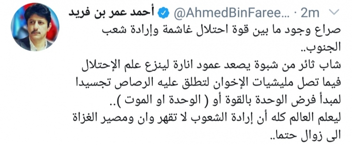 وكتب بن فريد، في تغريدة له عبر موقع التواصل الاجتماعي تويتر، تابعها المشهد العربي: "صراع وجود ما بين قوة احتلال غاشمة وإرادة شعب الجنوب".