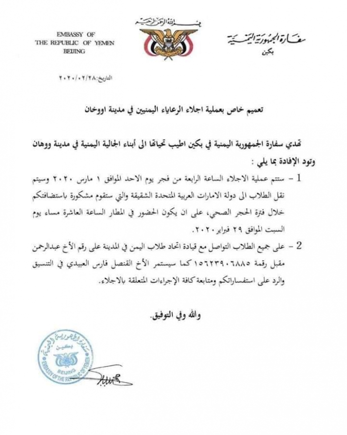 إجلاء الطلاب اليمنيين من ووهان إلى الإمارات الأحد المقبل (وثيقة)
