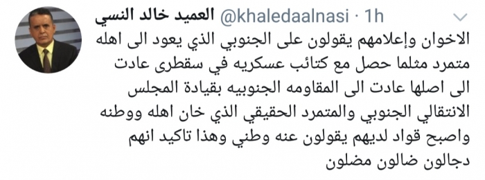وكتب النسي، في تغريدة له عبر موقع التواصل الاجتماعي تويتر، تابعها المشهد العربي: "الإخوان وإعلامهم يقولون على الجنوبي الذي يعود إلى أهله متمرد مثلما حصل مع كتائب عسكرية في سقطرى عادت إلى أصلها عادت إلى المقاومة الجنوبية بقيادة المجلس الانتقالي الجنوبي".