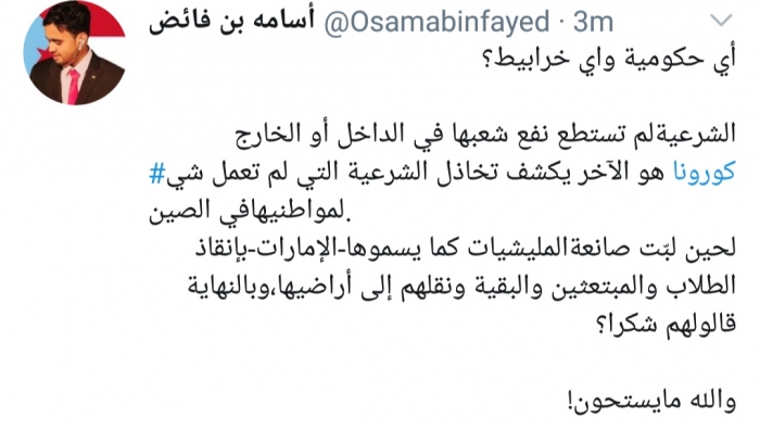 وتابع: "الشرعية لم تستطع نفع شعبها في الداخل أو الخارج"، مضيفا: "كورونا هو الآخر يكشف تخاذل الشرعية التي لم تعمل شيء لمواطنيها في الصين، لحين لبّت الإمارات بإنقاذ الطلاب والمبتعثين والبقية ونقلهم إلى أراضيها، وبالنهاية قالولهم شكرا؟ والله مايستحون".