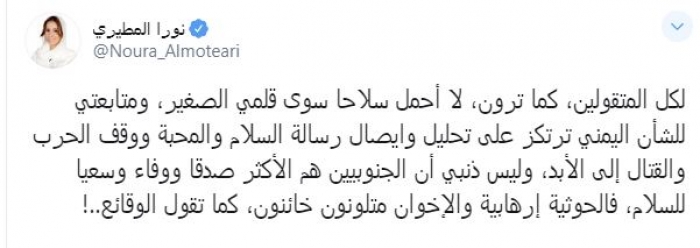 وكتبت في تغريدة عبر "تويتر" رصدها "المشهد العربي": "لكل المتقولين، كما ترون، لا أحمل سلاحًا سوى قلمي الصغير، ومتابعتي للشأن اليمني ترتكز على تحليل وايصال رسالة السلام والمحبة ووقف الحرب والقتال إلى الأبد، وليس ذنبي أن الجنوبيين هم الأكثر صدقا ووفاء وسعيا للسلام، فالحوثية إرهابية والإخوان متلونون خائنون، كما تقول الوقائع".