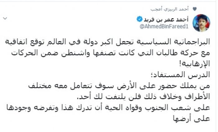 وكتب "بن فريد" في تغريدة عبر حسابه بتويتر، رصدها "المشهد العربي": "البراجماتية السياسية تجعل أكبر دولة في العالم توقع اتفاقية مع حركة طالبان التي كانت تصنفها واشنطن ضمن الحركات الإرهابية".