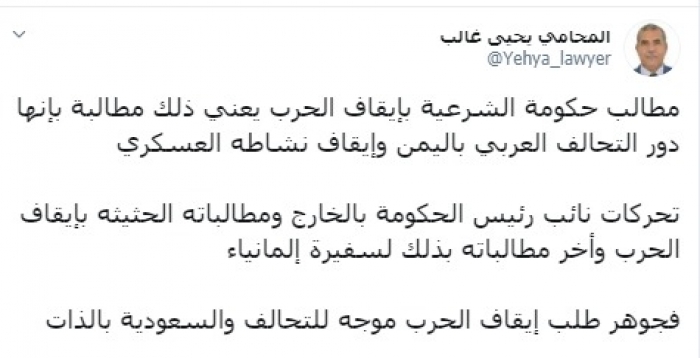 وكتب "غالب" في تغريدة عبر تويتر، رصدها "المشهد العربي": "مطالب حكومة الشرعية بإيقاف الحرب يعني ذلك مطالبة بإنها دور التحالف العربي باليمن وإيقاف نشاطه العسكري".