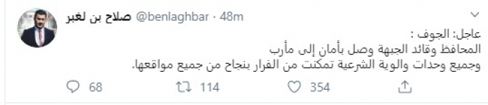 وقال في تغريدة عبر "تويتر" رصدها "المشهد العربي": "عاجل الجوف: المحافظ وقائد الجبهة وصل بأمان إلى مأرب وجميع وحدات وألوية الشرعية تمكنت من الفرار بنجاح من جميع مواقعها".