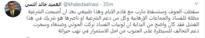 وكتب في تغريدة عبر "تويتر" رصدها "المشهد العربي": "سقطت الجوف وستسقط مأرب مع قادم الأيام وهذا طبيعي بعد أن أصبحت الشرعية مظلة للفساد والجماعات الإرهابية وكل من دعم الشرعية أو ناصرها هو شريك في هذا الفشل فقد كان واضح من البداية أن لوبيات الفساد تركت الحوثي وصنعاء وسخرت دعم التحالف للسيطرة على الجنوب من أجل الاستمرار في نهب خيراته".