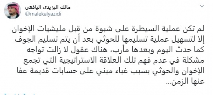 وقال في تغريدة عبر "تويتر" رصدها "المشهد العربي": "لم تكن عملية السيطرة على شبوة من قبل مليشيات الإخوان إلا لتسهيل عملية تسليمها للحوثي بعد أن يتم تسليم الجوف كما حدث اليوم وبعدها مأرب، هناك عقول لا زالت تواجه مشكلة في عدم فهم تلك العلاقة الاستراتيجية التي تجمع الإخوان والحوثي بسبب غباء مبني على حسابات قديمة عفا عنها الزمن".