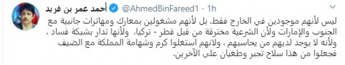 وقال في تغريدة عبر "تويتر" رصدها "المشهد العربي": "ليس لأنهم موجودين في الخارج فقط، بل لأنهم مشغولين بمعارك ومهاترات جانبية مع الجنوب والإمارات ولأن الشرعية مخترقة من قبل قطر - تركيا، ولأنها تدار بشبكة فساد، ولأنه لا يوجد لديهم من يحاسبهم، ولأنهم استغلوا كرم وشهامة المملكة مع الضيف فجعلوا من هذا سلاح تجبر وطغيان على الآخرين".