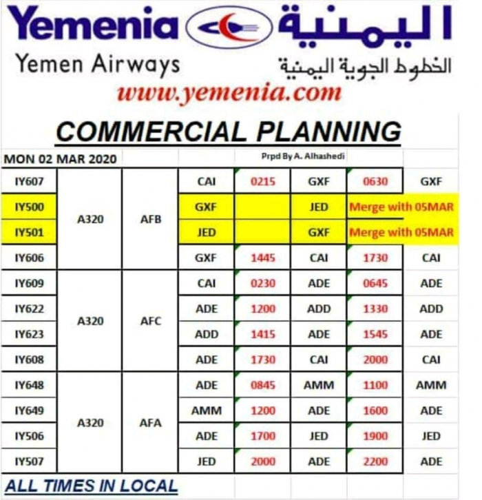 ينشر "المشهد العربي" مواعيد رحلات طيران اليمنية غداً الإثنين، الموافق 2 مارس 2020.