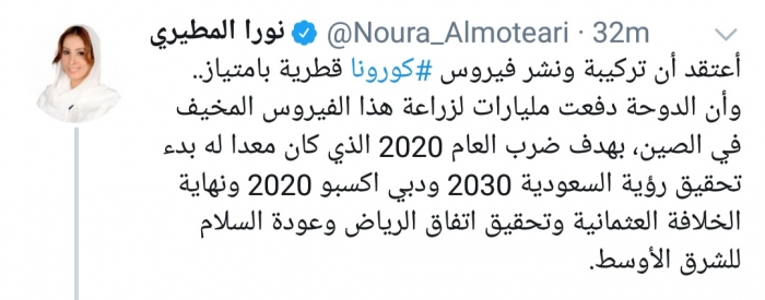 وكتبت المطيري، في تغريدة لها عبر موقع التواصل الاجتماعي تويتر، تابعها المشهد العربي: "أعتقد أن تركيبة ونشر فيروس كورونا قطرية بامتياز.. وأن الدوحة دفعت مليارات لزراعة هذا الفيروس المخيف في الصين، بهدف ضرب العام 2020 الذي كان معدا له بدء تحقيق رؤية السعودية 2030 ودبي إكسبو 2020 ونهاية الخلافة العثمانية وتحقيق اتفاق الرياض وعودة السلام للشرق الأوسط".