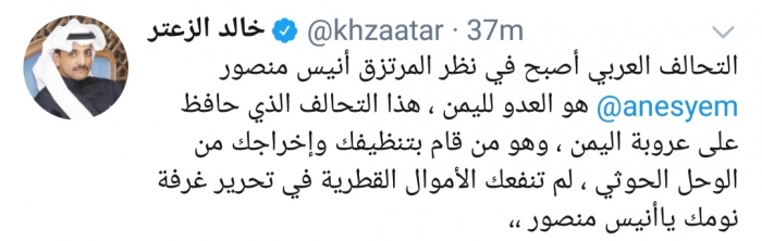 وكتب الزعتر، في تغريدة له عبر موقع التواصل الاجتماعي تويتر، تابعها المشهد العربي: "التحالف العربي أصبح في نظر المرتزق أنيس منصور هو العدو لليمن".