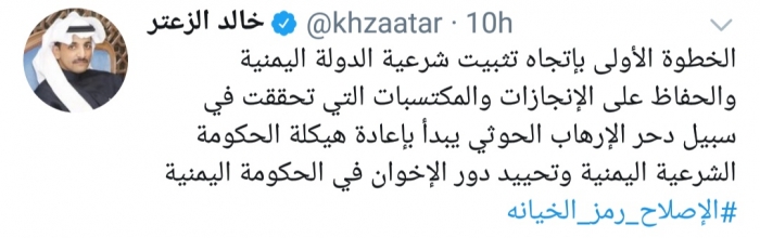 وكتب الزعتر، في تغريدة له عبر موقع التواصل الاجتماعي تويتر، تابعها المشهد العربي: "الخطوة الأولى باتجاه تثبيت شرعية الدولة اليمنية والحفاظ على الإنجازات والمكتسبات التي تحققت في سبيل دحر الإرهاب الحوثي يبدأ بإعادة هيكلة الحكومة الشرعية اليمنية وتحييد دور الإخوان في الحكومة اليمنية".