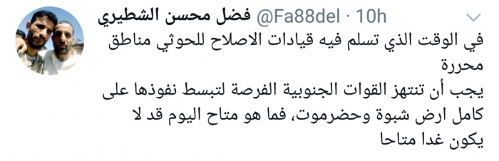 وتابع: "يجب أن تنتهز القوات الجنوبية الفرصة لتبسط نفوذها على كامل أرض شبوة وحضرموت، فما هو متاح اليوم قد لا يكون غدا متاحا".