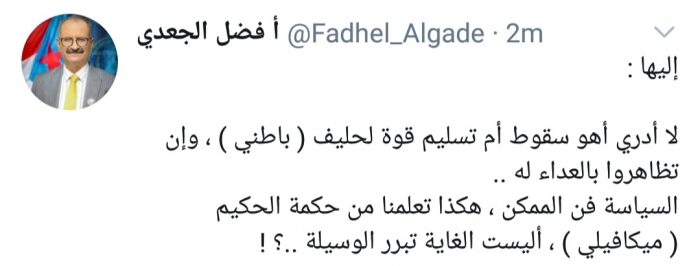 وكتب الجعدي، في تغريدة له على موقع التواصل الاجتماعي تويتر، تابعها المشهد العربي: "لا أدري أهو سقوط أم تسليم قوة لحليف باطني، وإن تظاهروا بالعداء له".