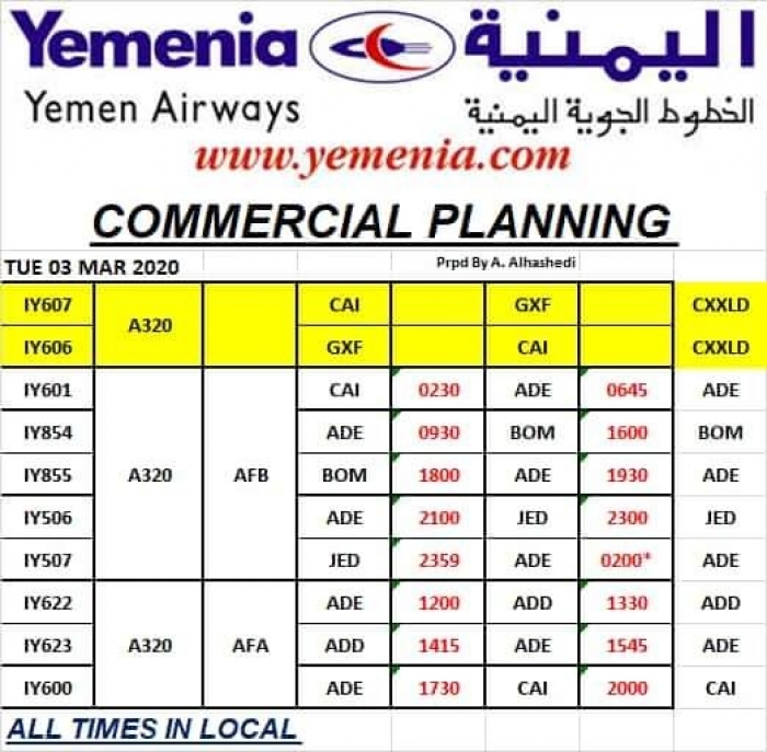 ينشر "المشهد العربي" مواعيد رحلات طيران اليمنية غداً الثلاثاء، الموافق 03 مارس 2020.