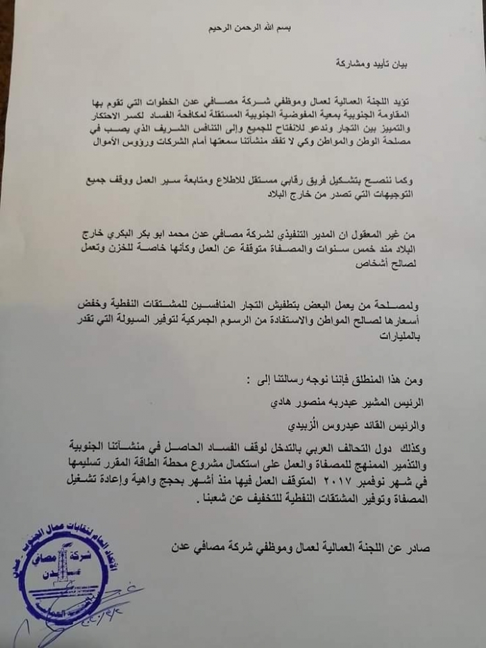 النقابة العمالية بمصافي عدن تؤيد قرار تحرير سوق المشتقات النفطية (وثيقة)