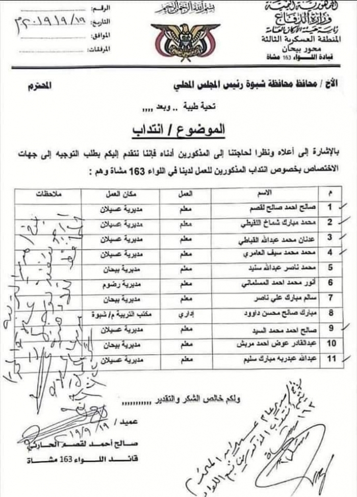 كشف خطاب متبادل بين محافظ شبوة الإخواني، المدعو بن عديو، وقيادة اللواء 163، الخاضع لسيطرة مليشيا الإخوان، عن انتداب عدد من المعلمين، للعمل باللواء.