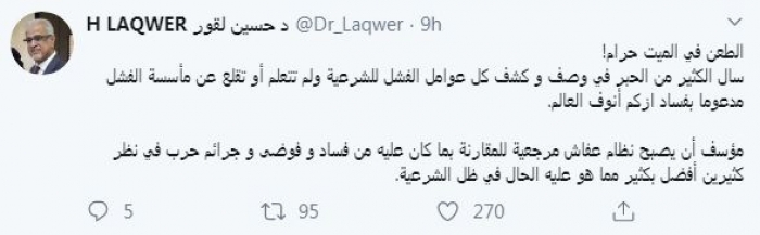 وقال في تغريدة عبر "تويتر" رصدها "المشهد العربي": "الطعن في الميت حرام! سأل الكثير من الحبر في وصف وكشف كل عوامل الفشل للشرعية ولم تتعلم أو تقلع عن مأسسة الفشل مدعومًا بفساد أزكم أنوف العالم. مؤسف أن يصبح نظام عفاش مرجعية للمقارنة بما كان عليه من فساد وفوضى وجرائم حرب في نظر كثيرين أفضل بكثير مما هو عليه الحال في ظل الشرعية".