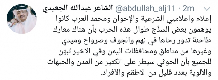 وكتب الجعيدي، في تغريدة له عبر موقع التواصل الاجتماعي تويتر، تابعها المشهد العربي: "إعلام وإعلاميي الشرعية والإخوان ومحمد العرب كانوا يوهمون بعض السذّج طوال هذه الحرب بأن هناك معارك طاحنة تدور رحاها في نهم والجوف وصرواح وميدي وغيرها من مناطق ومحافظات اليمن".