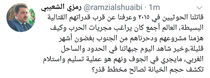 وكتب الشعيبي، في تغريدة له على موقع التواصل الاجتماعي تويتر، تابعها المشهد العربي: "قاتلنا الحوثيين في ٢٠١٥ وعرفنا عن قرب قدراتهم القتالية البسيطة".