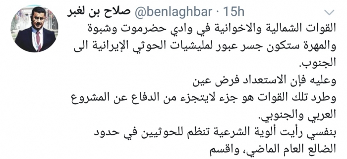 وكتب بن لغبر، في تغريدة له على موقع التواصل الاجتماعي تويتر، تابعها المشهد العربي: "القوات الشمالية والإخوانية في وادي حضرموت وشبوة والمهرة ستكون جسر عبور لمليشيات الحوثي الإيرانية إلى الجنوب، وعليه فإن الاستعداد فرض عين وطرد تلك القوات هو جزء لايتجزأ من الدفاع عن المشروع العربي والجنوبي".