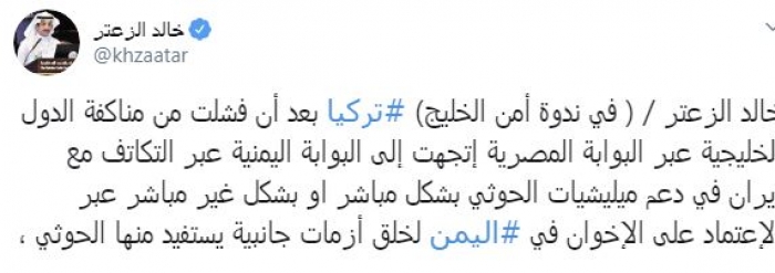 وكتب في تغريدة عبر "تويتر" رصدها "المشهد العربي": "تركيا بعد أن فشلت من مناكفة الدول الخليجية عبر البوابة المصرية اتجهت إلى البوابة اليمنية عبر التكاتف مع إيران في دعم ميليشيات الحوثي بشكل مباشر أو بشكل غير مباشر عبر الاعتماد على الإخوان في اليمن لخلق أزمات جانبية يستفيد منها الحوثي".