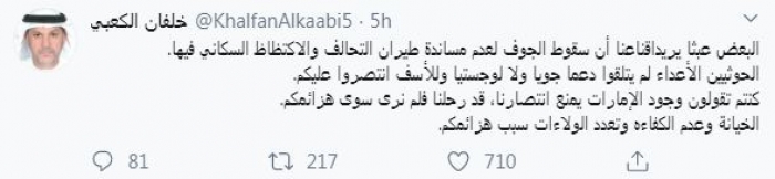 وأضاف: "كنتم تقولون وجود الإمارات يمنع انتصارنا، قد رحلنا فلم نرى سوى هزائمكم. الخيانة وعدم الكفاءة وتعدد الولاءات سبب هزائمكم".