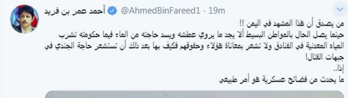 وقال في تغريدة عبر "تويتر" رصدها "المشهد العربي": "من يصدق أن هذا المشهد في اليمن حينما يصل الحال بالمواطن البسيط ألا يجد ما يروي عطشه ويسد حاجته من الماء فيما حكومته تشرب المياه المعدنية في الفنادق ولا تشعر بمعاناة هؤلاء وحقوقهم فكيف بها بعد ذلك أن تستشعر حاجة الجندي في جبهات القتال! إذا.. ما يحدث من فضائح عسكرية هو أمر طبيعي".