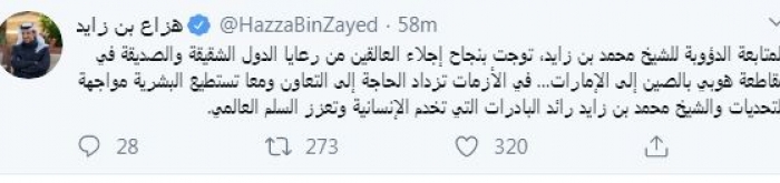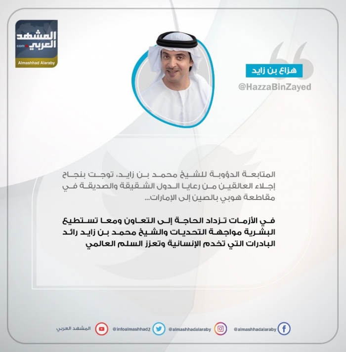 وقال في تغريدة عبر "تويتر" رصدها "المشهد العربي": "المتابعة الدؤوبة للشيخ محمد بن زايد، توجت بنجاح إجلاء العالقين من رعايا الدول الشقيقة والصديقة في مقاطعة هوبي بالصين إلى الإمارات... في الأزمات تزداد الحاجة إلى التعاون ومعا تستطيع البشرية مواجهة التحديات والشيخ محمد بن زايد رائد البادرات التي تخدم الإنسانية وتعزز السلم العالمي".