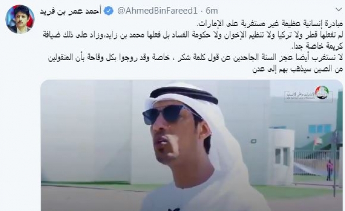وقال في تغريدة عبر "تويتر" رصدها "المشهد العربي": "مبادرة إنسانية عظيمة غير مستغربة على الإمارات. لم تفعلها قطر ولا تركيا ولا تنظيم الإخوان ولا حكومة الفساد بل فعلها محمد بن زايد، وزاد على ذلك ضيافة كريمة خاصة جداً".