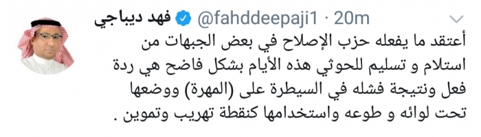 وكتب ديباجي، في تغريدة له على موقع التواصل الاجتماعي تويتر، تابعها المشهد العربي: "أعتقد ما يفعله حزب الإصلاح في بعض الجبهات من استلام و تسليم للحوثي هذه الأيام بشكل فاضح هي ردة فعل ونتيجة فشله في السيطرة على المهرة ووضعها تحت لوائه وطوعه واستخدامها كنقطة تهريب وتموين".